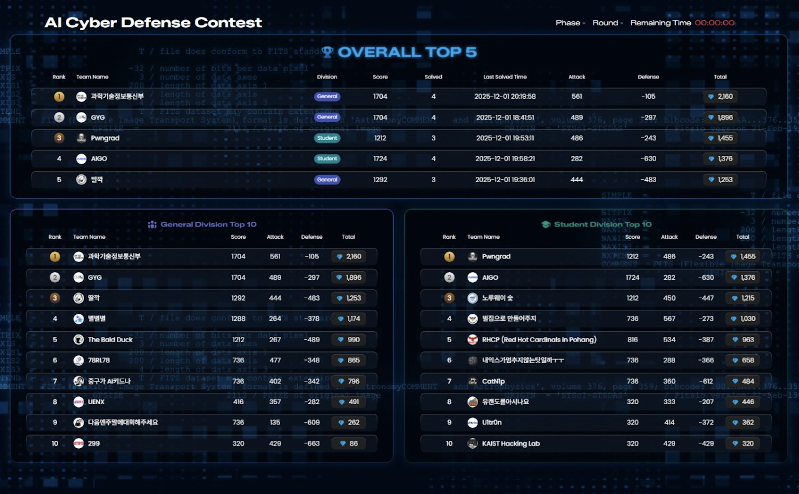 공방전에서는 초반에 2위를 유지했지만, 3라운드에서 예측하지 못한 공격이 들어오며 가드레일이 뚫려버렸습니다. 그 결과 최종적으로 20팀 중 3위를 기록했습니다.